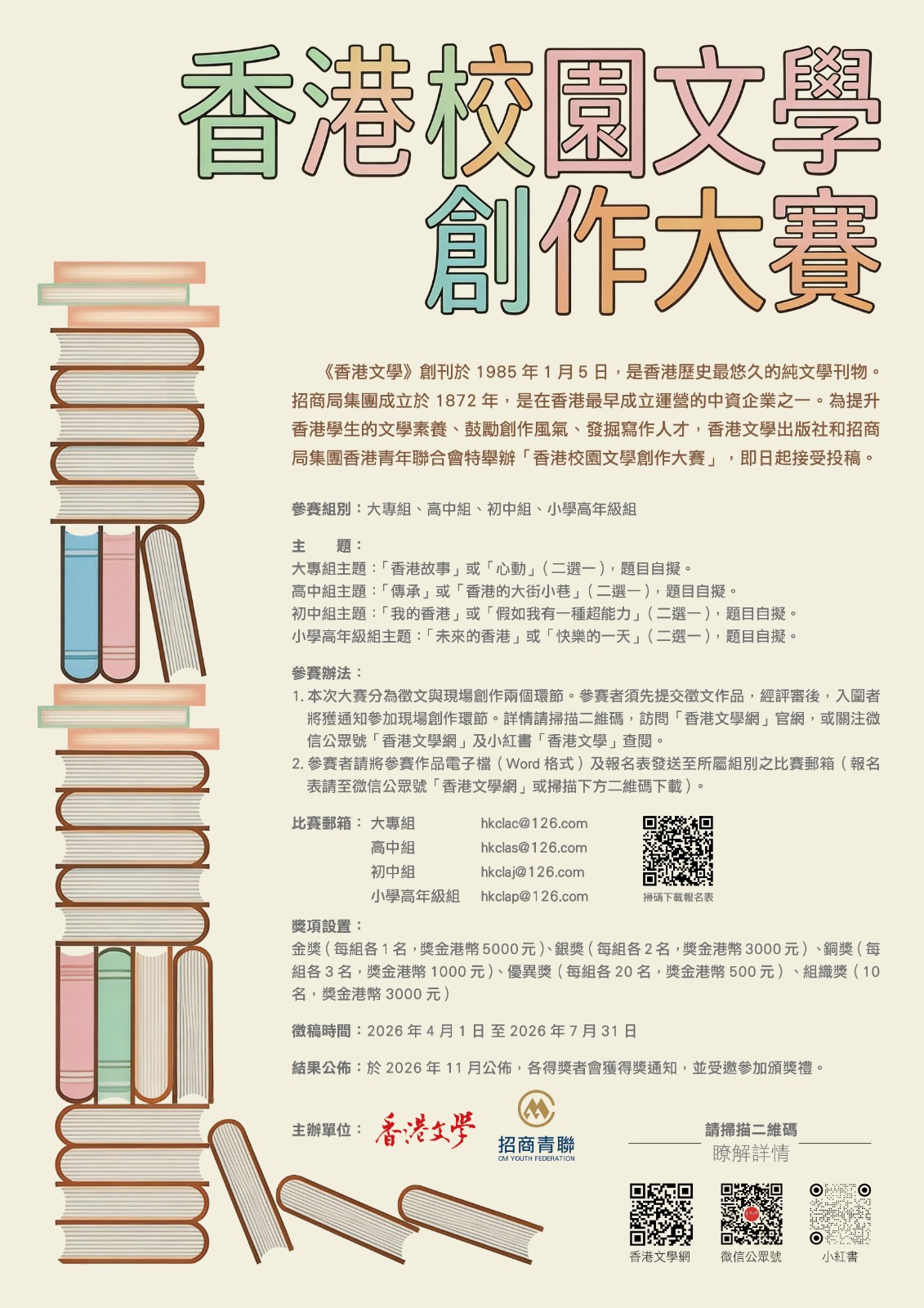 《香港文學》創刊於1985年1月5日,是香港歷史最悠久的純文學刊物。招商局集團成立於1872年,是在香港最早成立運營的中資企業之一。為提升香港學生的文學素養、鼓勵創作風氣、發掘寫作人才,香港文學出版社和招商局集團香港青年聯合會特舉辦「香港校園文學創作大賽」,即日起接受投稿。現將大賽有關事宜說明如下: 一、主辦機構香港文學出版社招商局集團香港青年聯合會 二、協辦機構香港青年作家協會 三、徵稿時間20......